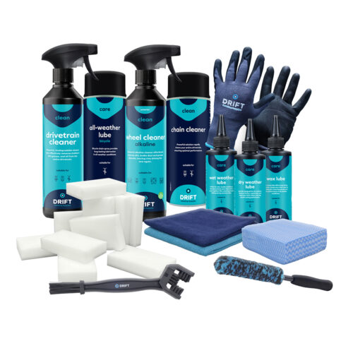 Voor de aandrijflijn biedt de set geavanceerde oplossingen zoals de Drivetrain Cleaner en Kettingreiniger, aangevuld met een Fietskettingborstel en een Cassetteklauw- en Aandrijflijnborstel. Deze tools maken zelfs de lastigste plekken eenvoudig schoon, zodat uw ketting en tandwielen optimaal blijven presteren. Of het nu droog, nat of wisselvallig weer is, met de keuze uit Chain Lube Dry Weather, Wet Weather, en Wax, of de veelzijdige All Weather Kettingspray, is uw ketting altijd perfect gesmeerd.